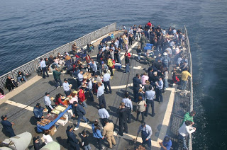 Quarters: a gathering of all the people in the organization – Quarters can be for the entire command, or just the department, division, or branch. Quarters is used to present awards, pass information, and make every sailor squeeze into their ill-fitting, rarely-worn uniforms at least once a year. “Quarters” also refers to the daily morning muster for each division, announced as “Quarters…Quarters…All hands to Quarters for muster, instruction, and inspection.” Often held outside on the weather decks when not raining. But even sometimes when it did rain.