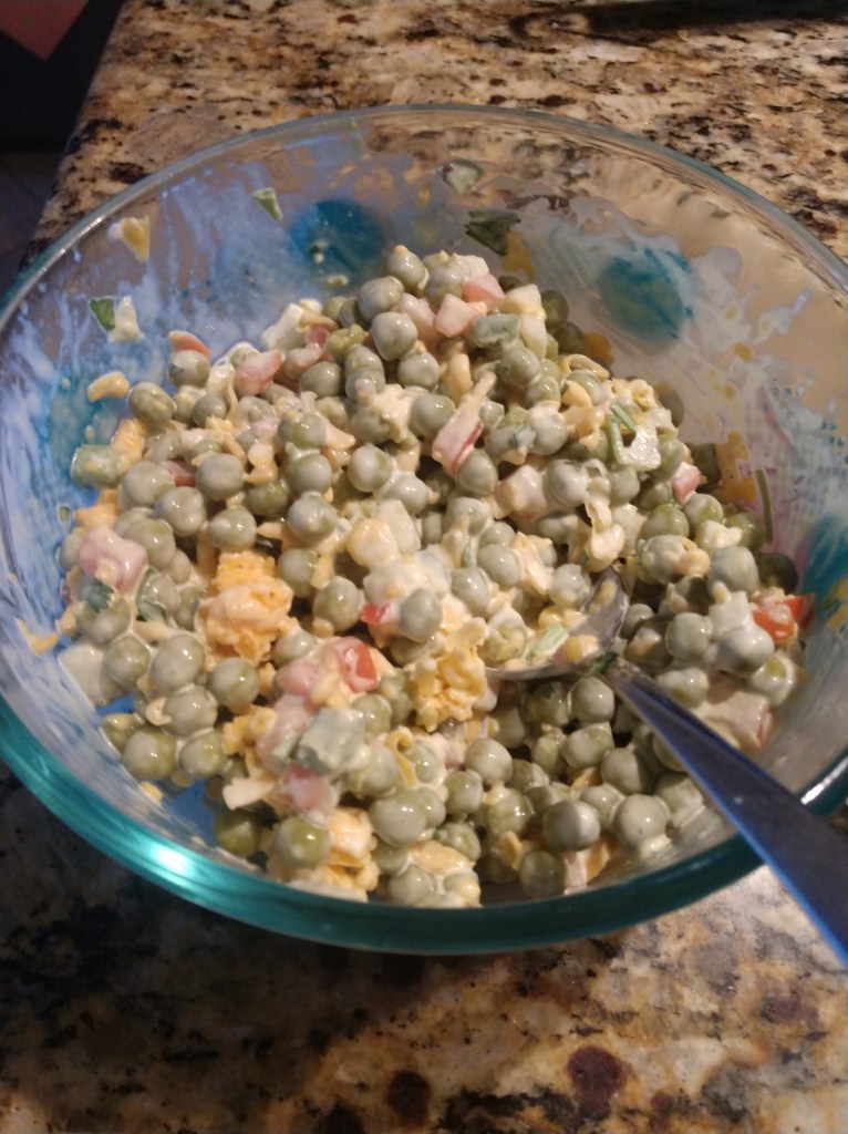 Anyone else eat pea salad? Only my mother and sister. And me! Not mini. She’ll eat plain sweet peas, but once you add additional ingredients, she abandons ship. More for me! I like to experiment with pea salad. In the photo below, I subbed pico for the traditional onion only. It was superb, in my opinion. And since I’m the only one eating it, here we are.