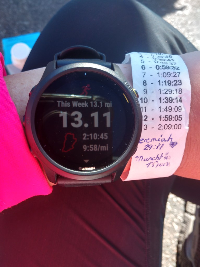 Yes, I met my goal of a 2:10 half marathon! Specifically, I ran 2:10:45 with an avg 9:58 pace. I asked my feet to fly and they did what I’d trained for with an 8 min PR! It was a lovely 35° at the start line – I met the most awesome people! My 2:10 pace crew also seemed nice.