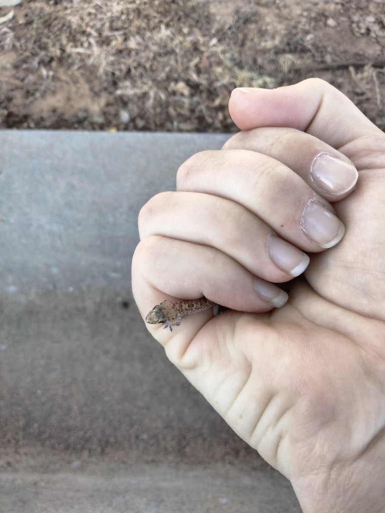 As most people do, I wear many hats in the office. Recently I was a baby lizard wrangler. My incredible co-worker, Ms. P., doesn’t like me to dispose of any living creature we find. Even the crickets but I do it anyway. However, I make exceptions for lizards. I relocated him outdoors. Funny how I got her a flyswatter and she’ll use that thing on anything. Hmmmmm.