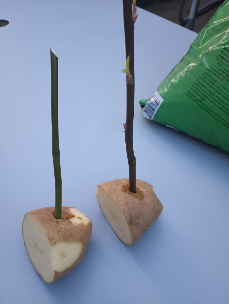 Spare Parts had a fabulous idea to propagate roses using only a random TikTok video for reference. It included cutting rose stems, shoving them into a potato, and planting the whole mess. Her parting words were “…now we plant them and hope we don’t grow potatoes!” We both had a good laugh.