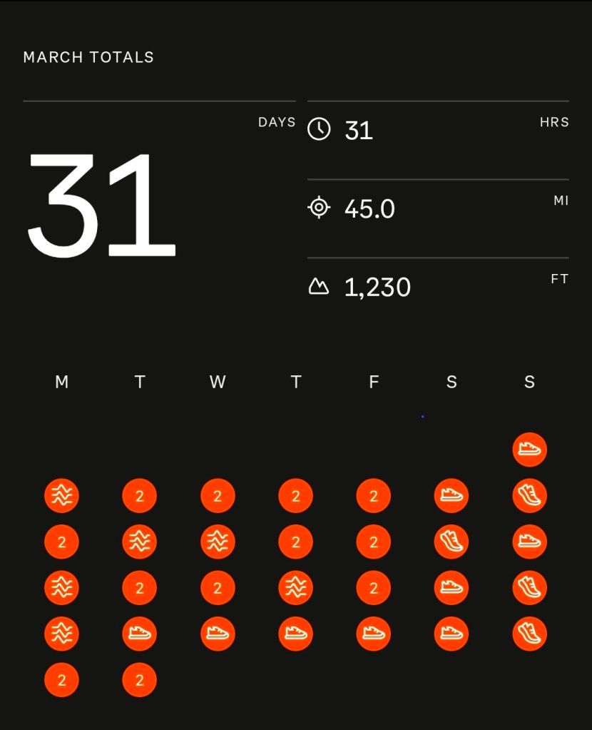 March movement totals weren’t too bad considering this new age bracket. 40+. It looks like I decreased on the two-a-day workouts, but it was probably for the best.