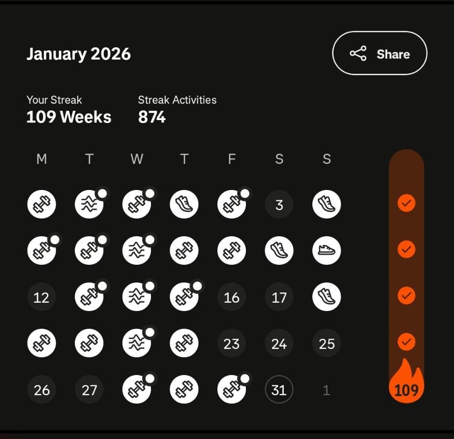 Although I intended to complete a workout every single day of January, meh. Life happened. P.S. I’m not sure why the graphic says February 2026, when it hasn’t arrived yet. Weird.