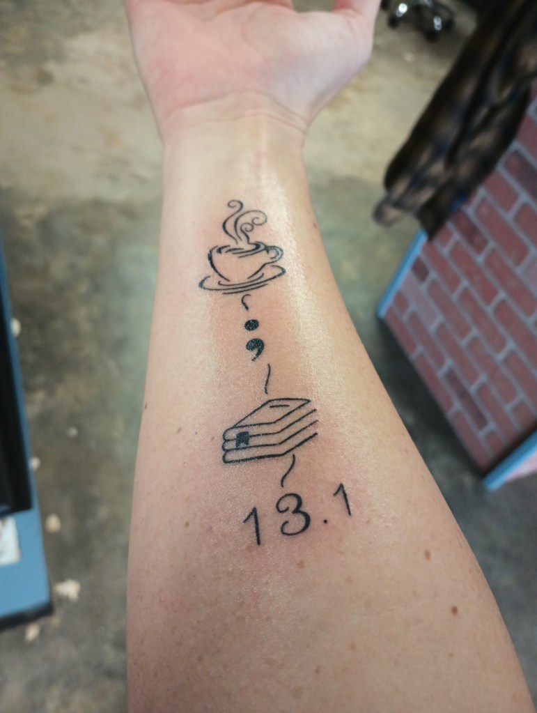 From top to bottom: The coffee cup is my own personal trademark because I rarely am not drinking coffee. The semicolon is very close to my heart as it symbolizes a pause, a breath, a short break in thoughts, and is often used for suicide awareness, of which my father took his own life when I was 10. The stack of books is twofold: 1) I love to read, always have and 2) as a lifelong learner and career college student, then books made sense. Finally, the 13.1 represents my adoration for running the half marathon distance.