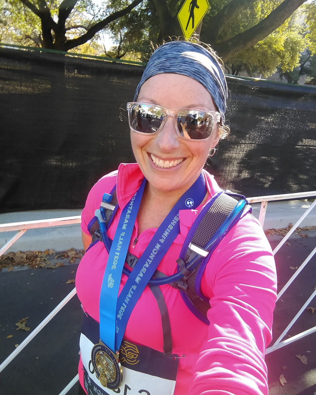 So here’s the ugly. Because I spent the first almost half of the race running faster than I had trained for, miles 6-11 were brutal. The walking increased, even though I was still mostly holding on to a 9:45 pace. I began to favor my left hip/leg/hamstring/knee which caused a lot of pain in my right foot. So glad I decided to put BCAAs in my CamelBak and fuel with jelly beans. Even then, those middle miles felt awful.