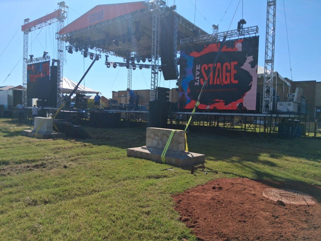 Being a part of the planning and scheduling and leading and quite frankly the chaos of a huge event like a concert consumed more than a week of my time. Thankfully, only one task fell squarely on my shoulders. Anything more and I would have sank like the JLG in the soft ground. Evidence in the photos above. I’m surprised the large monument-sized anchors in the foreground didn’t sink. Speaking of monuments, those are called pet rocks. When I insisted they look like headstones, I was informed the difference between pet rocks and headstones is the pet rocks have had the “coating” removed. OK, fine. However, now I wonder did someone gift the military dozens of headstones? And why? Perhaps they didn’t believe in air power.