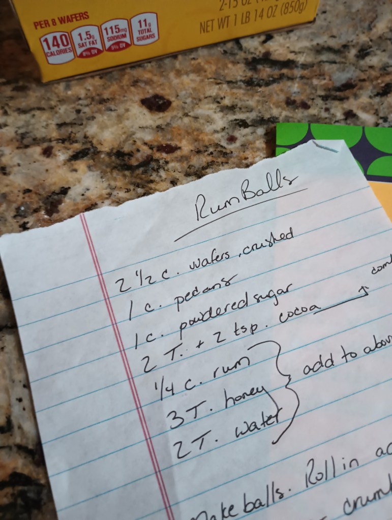 But why is the rum gone??? It’s not like I can buy any today (Sunday). Sounds like a Monday problem. Thankfully, the base exchange provided the rum I needed to make my infamous rum balls. Personally, I prefer Amaretto Truffles, but these will do, too. Even mini thought they were pretty good. She slept so well that night. Weird.